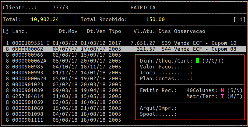 40Colunas: | Informe a letra S para que o sistema gere o comprovante de pagamento no mesmo formato que cupom fiscal. |