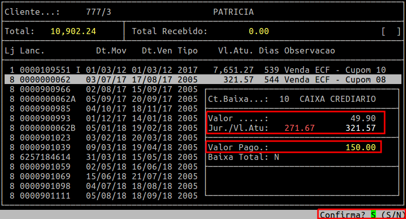 Assim que preencher os campos acima, pressione a tecla Enter ou S para confirmar a baixa parcial para um determinado lançamento.