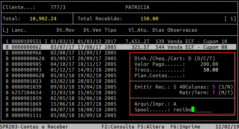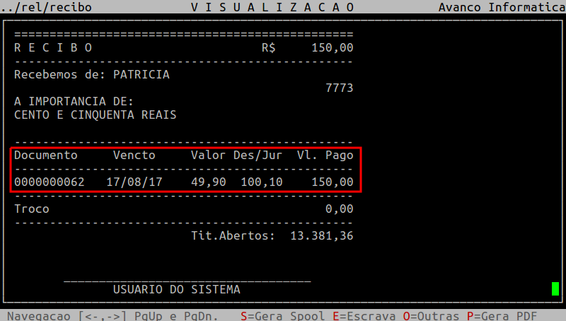 Para visualizar o comprovante, pressione a tecla F8 e informe o nome dado ao Spool.