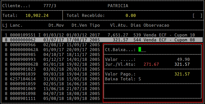 Observe no exemplo abaixo, que no campo Total Recebido gravou o valor parcial da baixa.