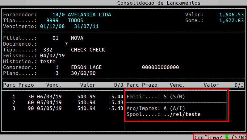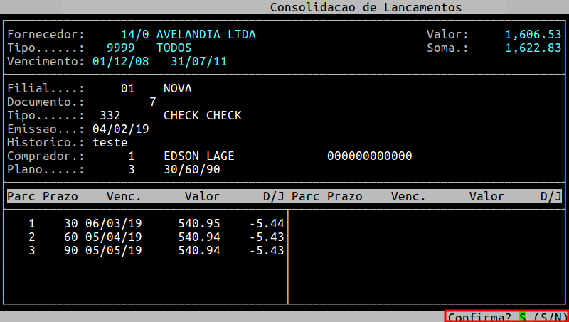 No exemplo abaixo, foi informado N na tela das alterações, no qual em seguida o sistema exibe a pergunta "Confirmar?", sendo necessário pressionar Enter ou S para gravar.