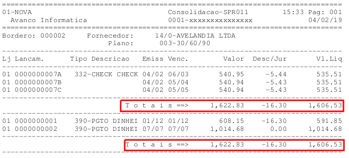 Observe nos exemplos acima, que a data de pagamento fica com 99/99/99, ao lado das datas aparece o número do documento da consolidação 0000000007A e a consolidação 000002. Esses pontos auxilia na identificação de um lançamento consolidado e até mesmo para realizar o estorno.