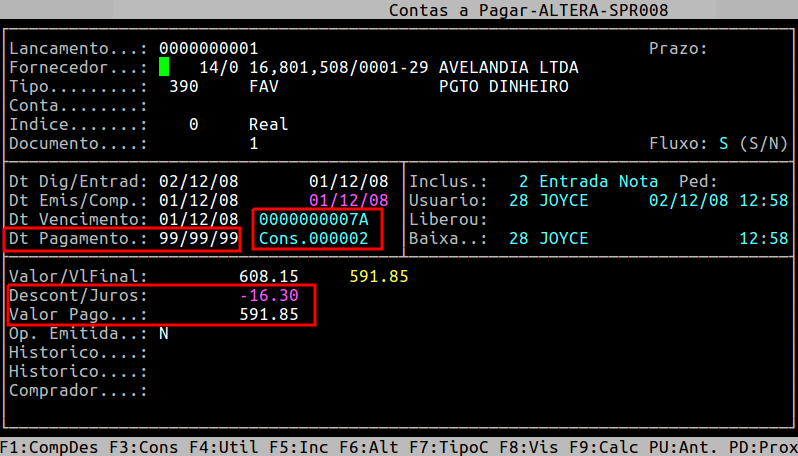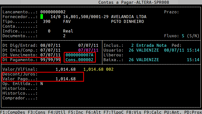 Localização: | Administracao Financeira / Contas a Pagar / Lancamentos / Manutencao / Alteracao / Individual |