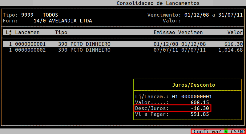 No exemplo abaixo, foi utilizado a tecla F3 para selecionar todos os lançamentos. Observe que o valor dos lançamentos selecionados já contém o desconto de 16,30.