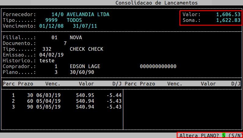 O sistema exibe a pergunta "Altera Plano?", no qual deverá informar S se desejar alterar o vencimento, os valores de cada prazo e o desconto/juros rateado ou N para não alterar.