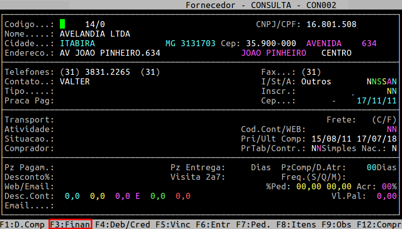 Ao acessar a rotina, informe o código do fornecedor desejado (sem o dígito verificador) e pressione a tecla Enter para carregar as informações do cadastro. Em sequência, pressione a tecla F3 (Finan) para acessar a tela do financeiro do fornecedor.