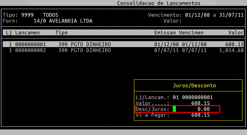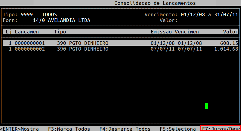 Em sequência, para carregar as informações, pressione a tecla Enter novamente. No rodapé da rotina é exibido algumas opções referente a seleção dos lançamento e a inclusão de juros/desconto.