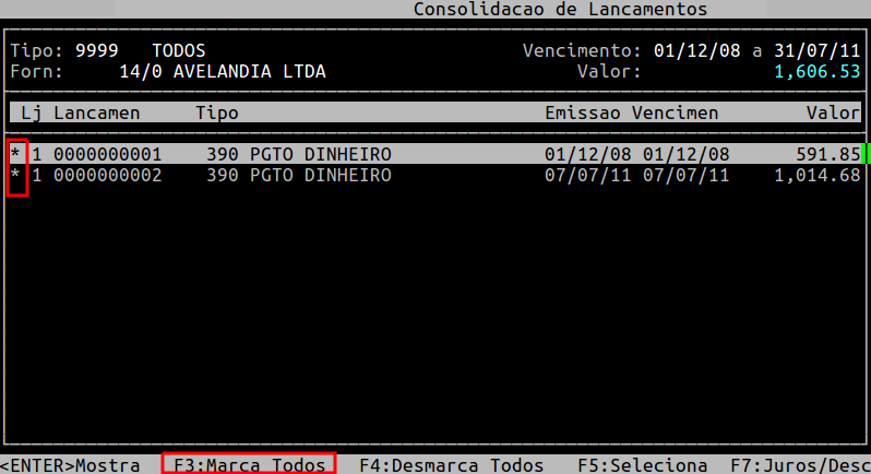 Outras opções do rodapé seria marcar todos os lançamentos que aparecem na tela (tecla F3), ou selecionar individualmente (tecla F5) ou desmarcar todos os lançamentos selecionados (tecla F4).