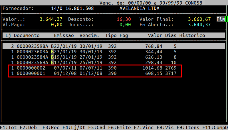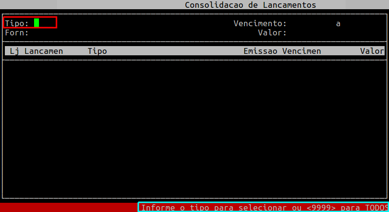 Ao informar o tipo gerencial, pressione a tecla Enter para informar o intervalo de vencimento dos lançamentos e mais um Enter para informar o fornecedor desejado.