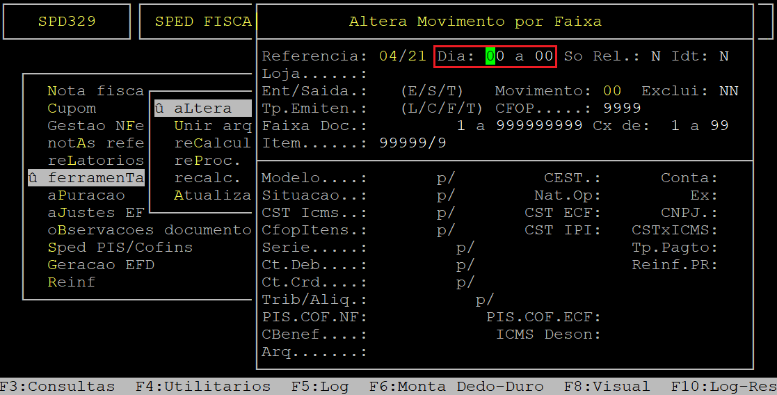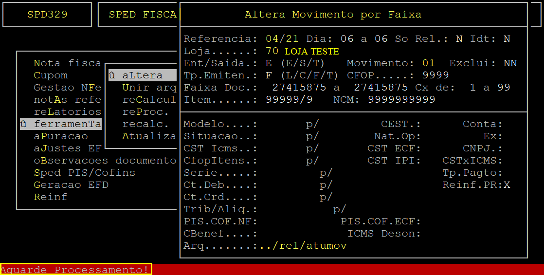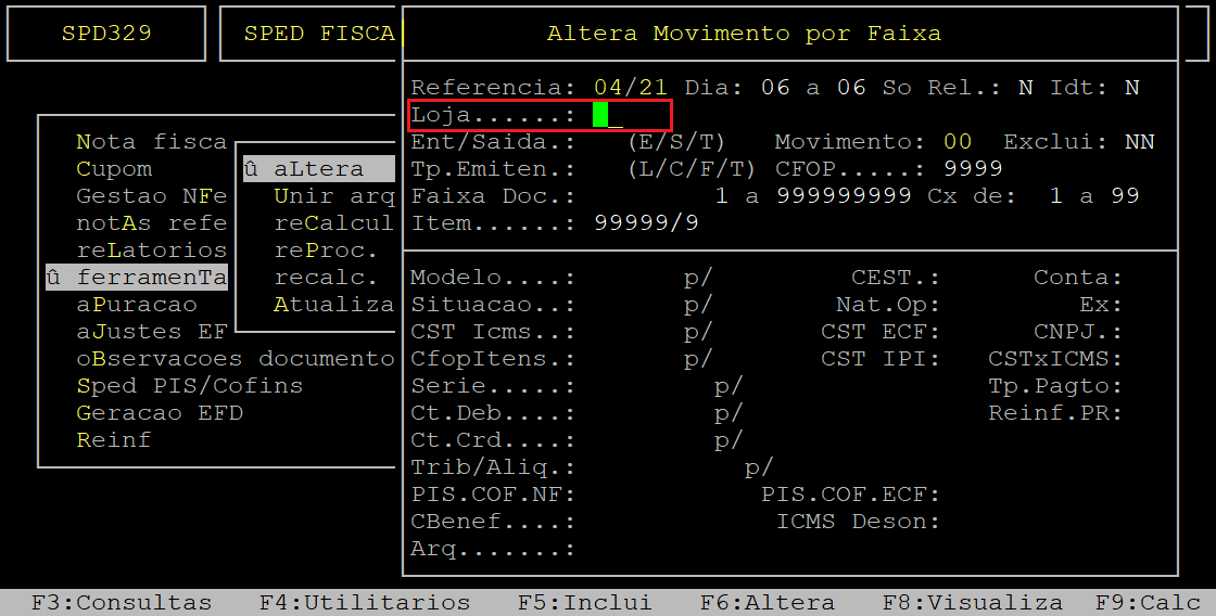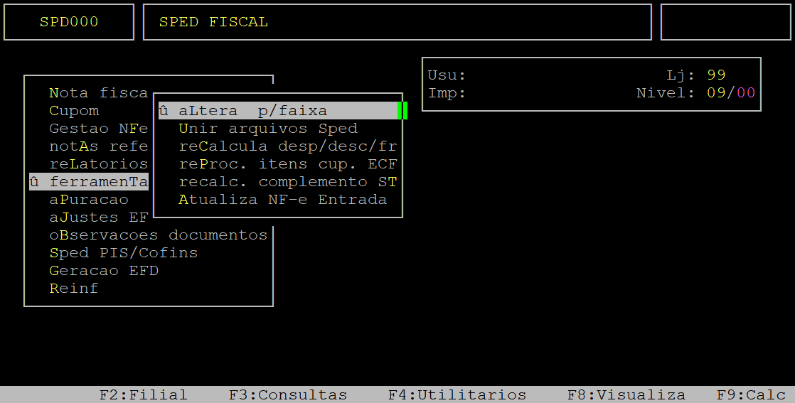 Localização: | SPED EFD - NFe NFCe / Ferramentas / altera p - faixa |