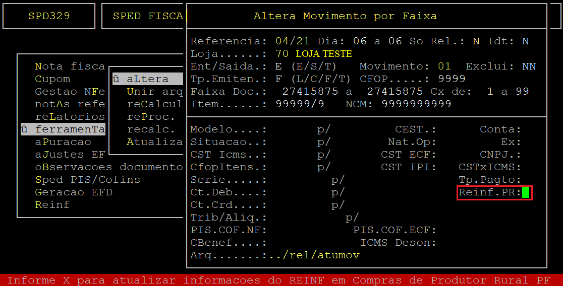 No campo Reinf.PR, informe a letra X para atualizar os dados do REINF da faixa de documentos definido.