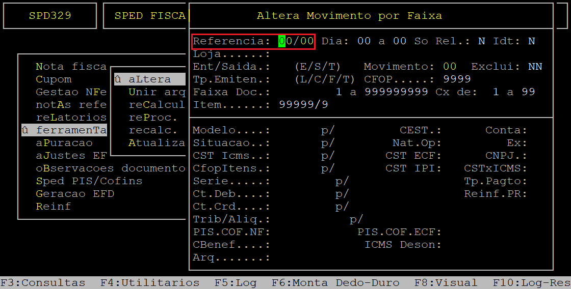 Ao acessar a rotina Altera Movimento por Faixa, no campo Referencia informe o mês (com dois dígitos) e o ano (com dois dígitos) desejados e, aperte a tecla Enter.