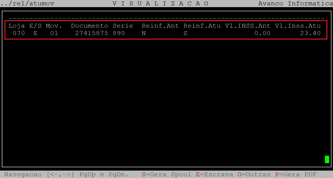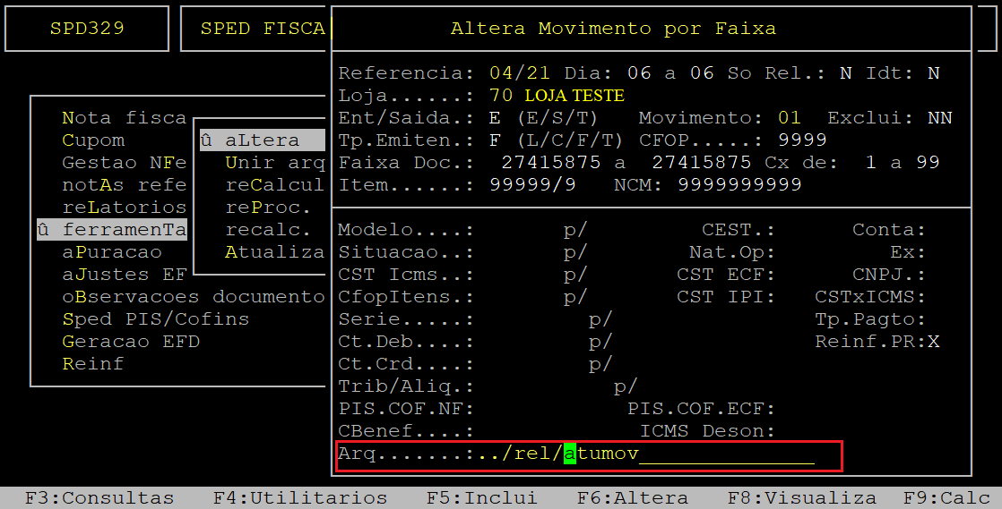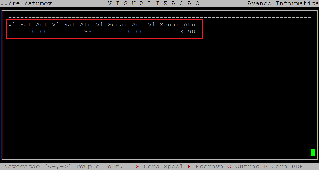 Após finalizar a rotina altera por faixa, aperte a tecla F8, informe o nome dado no campo Arq (padrão do sistema atumov) e, aperte a tecla Enter para visualizar o relatório na tela, conforme os exemplos abaixo.