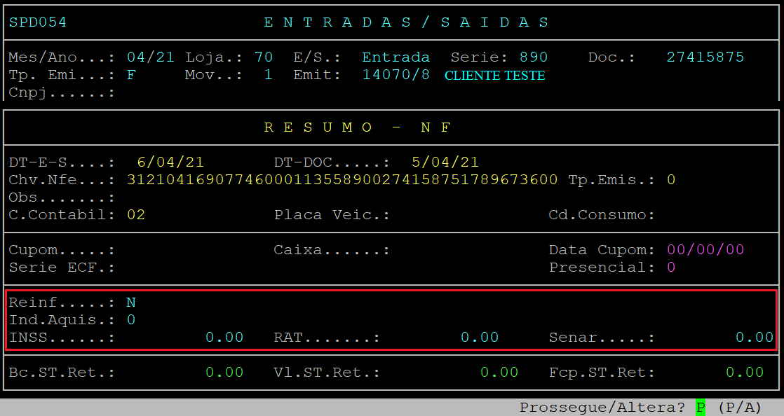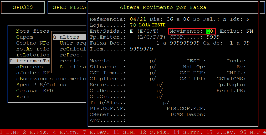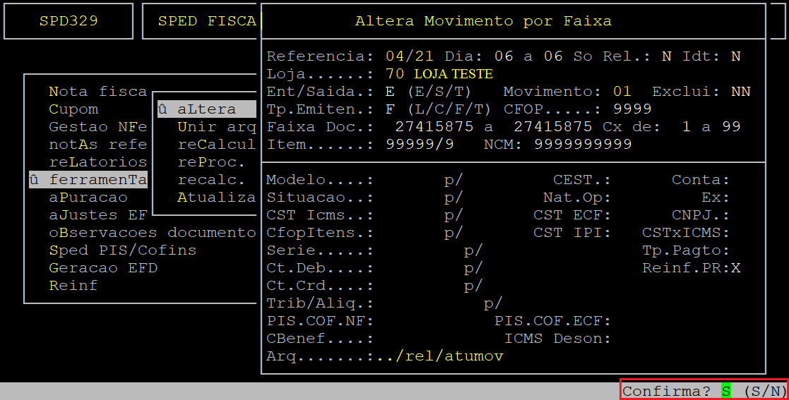 Ao ser exibida a pergunta " Confirma? ", aperte a tecla Enter ou S para confirmar e gravar a alteração realizada na rotina de Movimento do Sped.