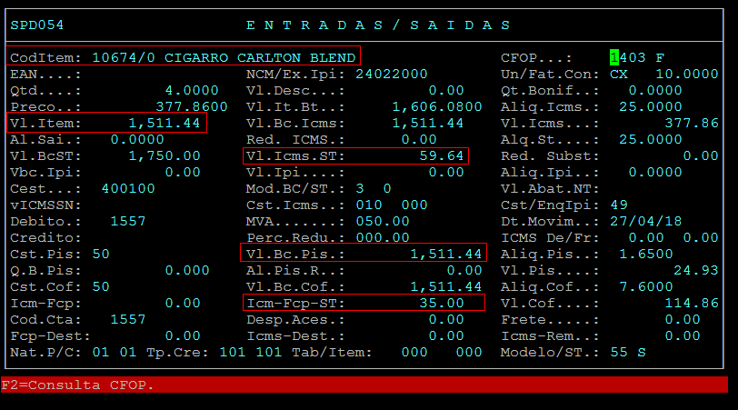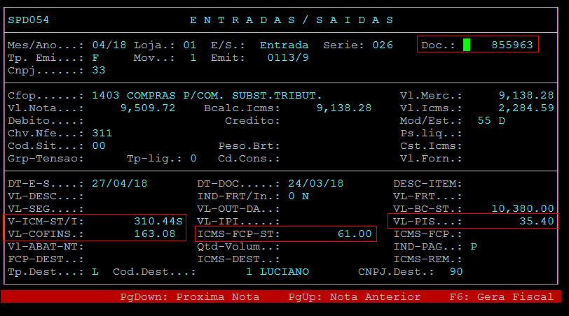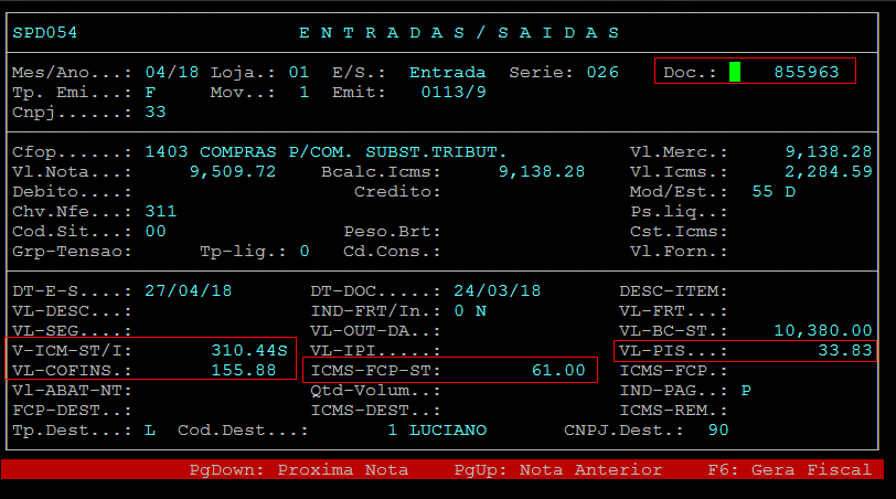 Segue um exemplo de uma nota de entrada/compra com ST e FCP.