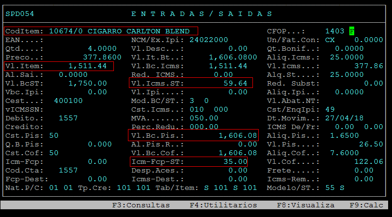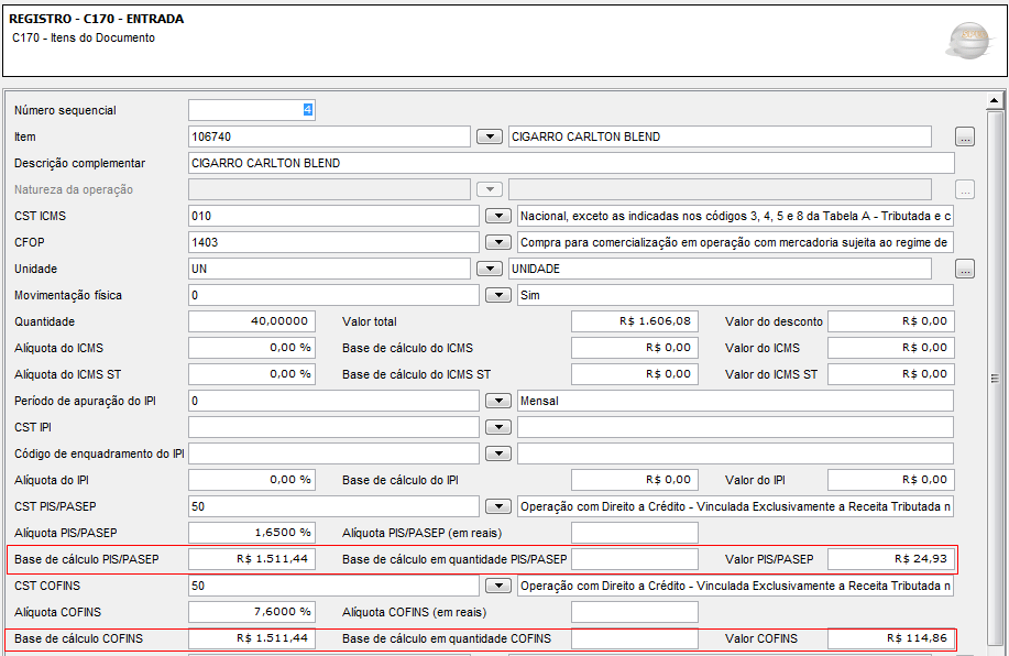 Observação: ao realizar a comparação com o mesmo item no tópico "1.1 - Exemplo caso Parâmetro Setado em N - Não" é possível perceber que o campo "Vl. Bc. Pis" está com o valor R$ 1.606,08, sendo assim é possível concluir que ao configurar o parâmetro "ST/ICMS" com "S - Sim" consequentemente irá retirar a substituição tributária da base de cálculo do PIS/COFINS, e o valor passará a ser R$ 1.511,44. |