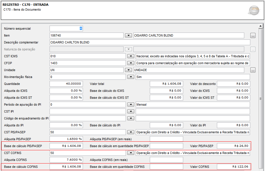 | Base de cálculo COFINS: | R$ 1.606,08 |