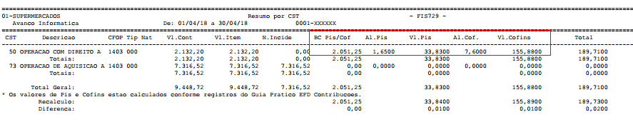 Sendo assim é possível observar os valores de PIS e COFINS no relatório.