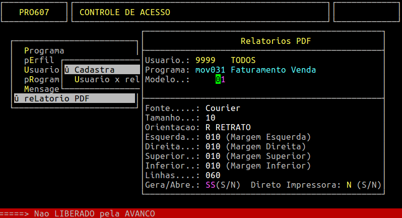 Ao informar um programa, no qual não gera relatório em PDF ou que não é reconhecido na rotina, o sistema informará que ele não é liberado pela Avanço, conforme exemplo abaixo.