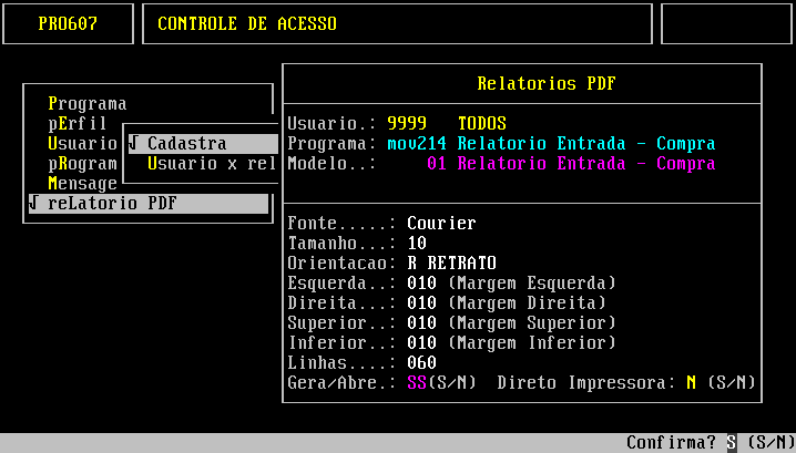 | Gera/Abre: | No primeiro campo informe S para gerar o relatório em PDF. No segundo campo informe S para abrir o relatório. |
