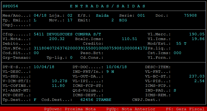 CFOP 5411 - valor contábil: 190,10 e ICMS: 19,86