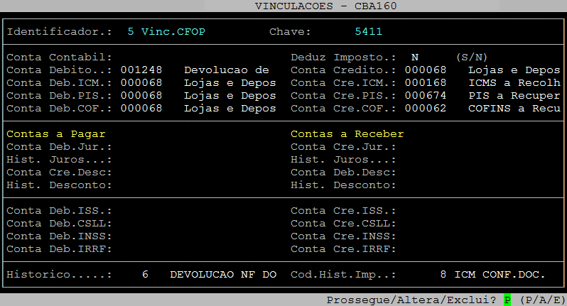 | Localização: | Cadastros Basicos / Tabelas / Outras Tabelas / Contabeis / Vinculacoes Contabeis |