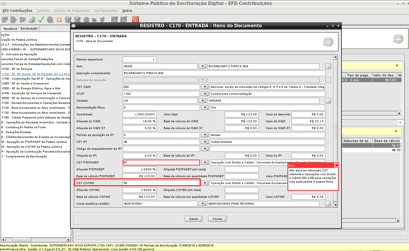 No exemplo abaixo, é mostrado o erro no registro C170, referente ao CST com direito a crédito que foi informado para um participante pessoa física.