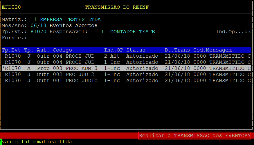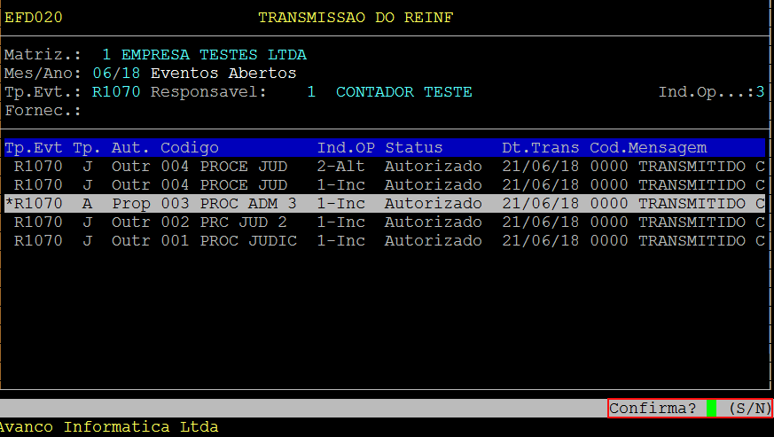 Após, pressione a tecla F5:Envia, será exibido a pergunta: Realizar a Transmissão dos Eventos?. Para realizar a transmissão, confirme pressionando a tecla S (Sim).