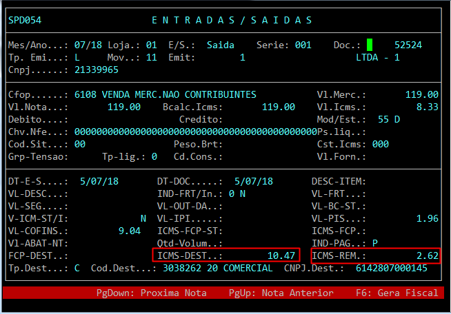 Na tela acima é possível ver os valores da partilha do ICMS nos campos ICMS-DEST e ICMS-REM.