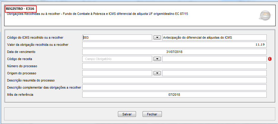 Observação: O Registro E316 corresponde as obrigações do ICMS recolhido ou a recolher - Diferencial de Alíquota - UF Origem/Destino. |