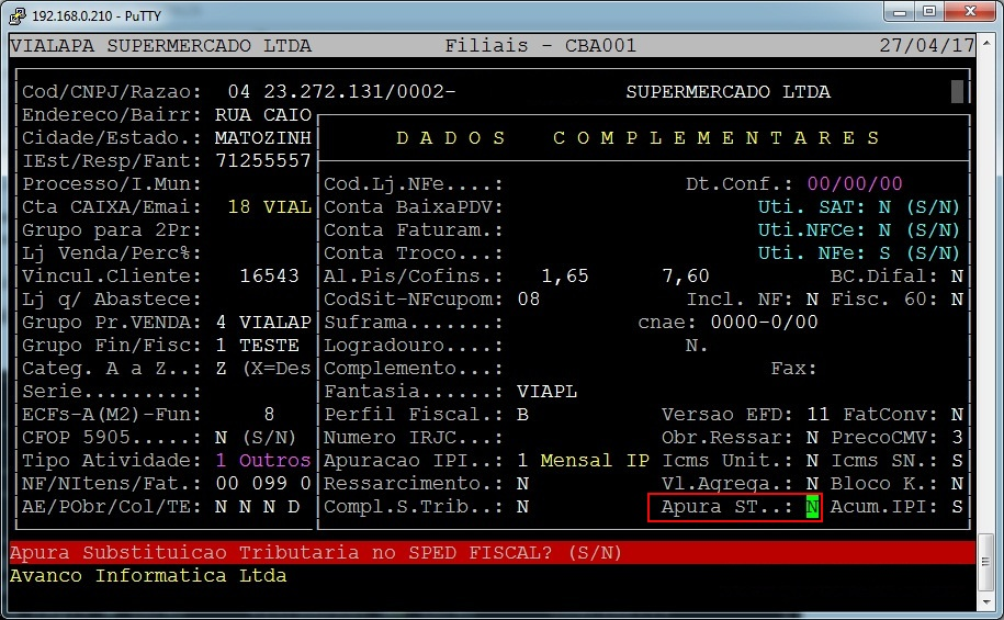 Acesse a localização citada acima, no campo Apura ST, pressione a tecla S.