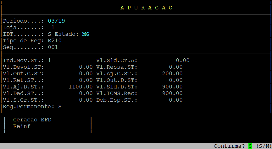 O contribuinte emitirá, ao final do período de referência, a NF-e em seu próprio nome, no qual deverá conter nos campos próprios as seguintes indicações: com o CFOP 5.949 deverá conter " Complemento De ICMS ST ", e com o CFOP 1603 deverá conter " Aspecto quantitativo ". O contribuinte de Minas Gerais (MG) deve lançar os dados da NF-e no registro C100 e demais registros filhos exigidos pela legislação e complementar o lançamento com os registros C195 e C197, sendo refletidos no Bloco E210-Apuração do ICMS ST.