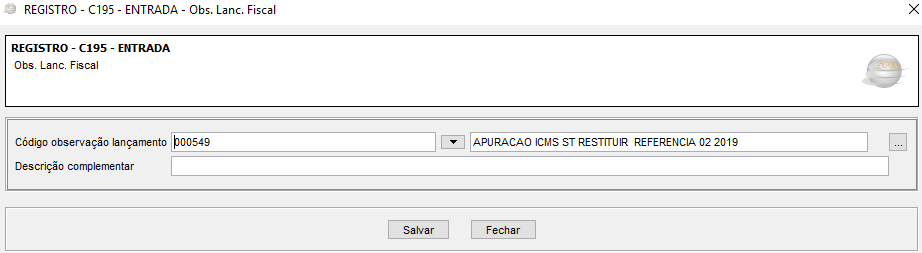 Abaixo segue o exemplo da tela da gravação da nota fiscal, do exemplo anterior, no Registro C195, referente a emissão da Nota Fiscal de Restituição de ICMS ST.
