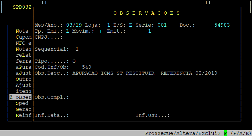 Abaixo segue um exemplo, da observação referente a nota fiscal 54983.