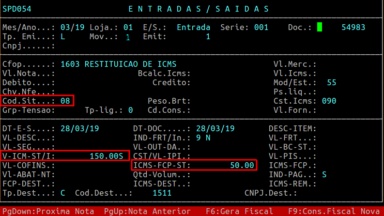 Abaixo segue o exemplo da tela da gravação da nota fiscal, do exemplo anterior, no Registro C100, referente a emissão da Nota Fiscal de Restituição de ICMS ST.