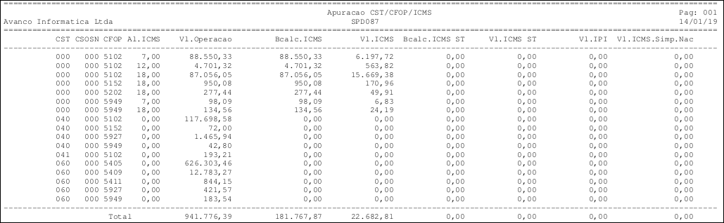 | CST: | CST dos lançamentos, aparece separados por CFOP e alíquota. | |
