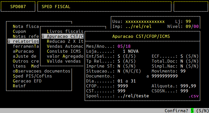 | CST: | Informe o CST especifico, se desejar utilizar esse filtro, ou pressione a tecla Enter para sair todos os CSTs (999). | |