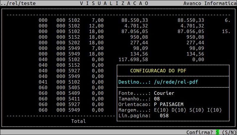 Em seguida, para visualizar o relatório, pressione a tecla F8 e informe o nome dado ao Spool para visualizar na tela ou em seguida, pressione P para gerar na pasta no formato .pdf /u/rede/rel-pdf (conforme exemplo abaixo).