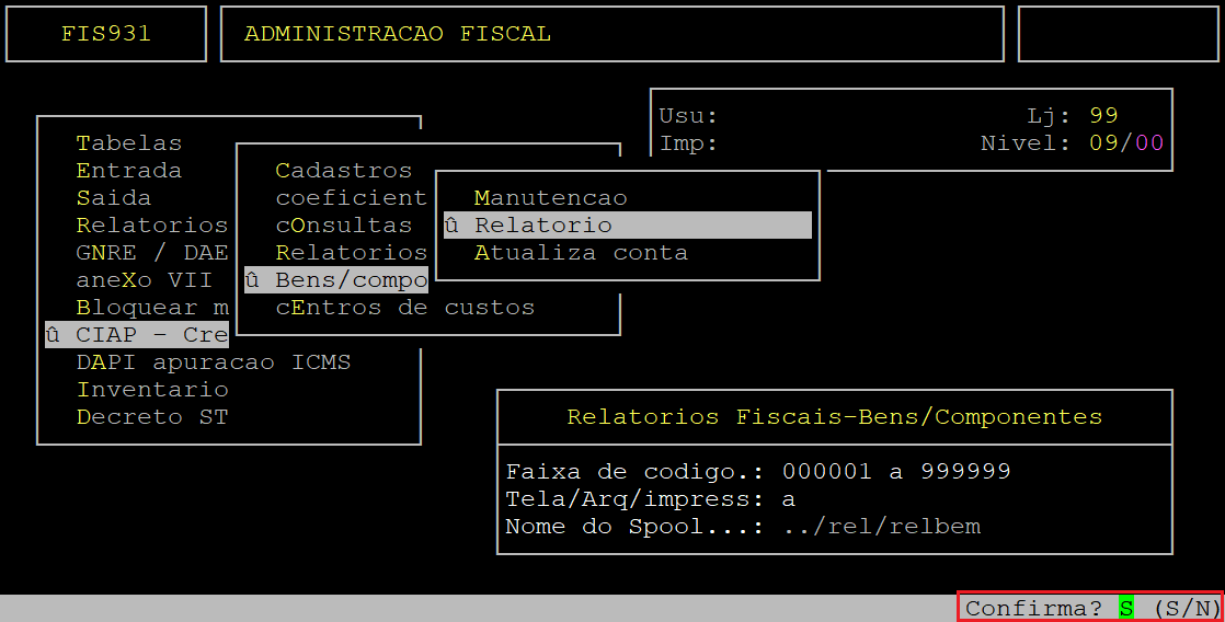 | Rotina: | Relatórios Fiscais - Bens / Componentes |