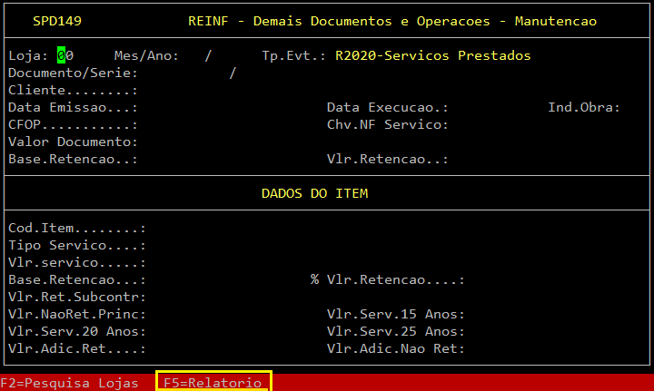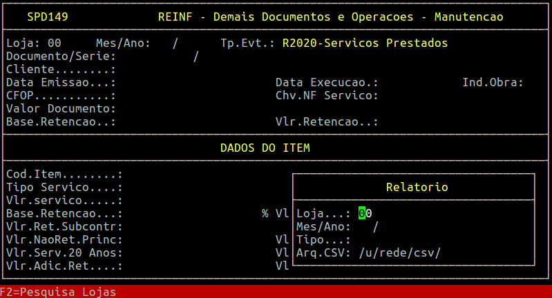 | Localização: | Sped - Efd / Reinf / Eventos - Inclusao / R2020 Serv. Prestados / Inclusao |