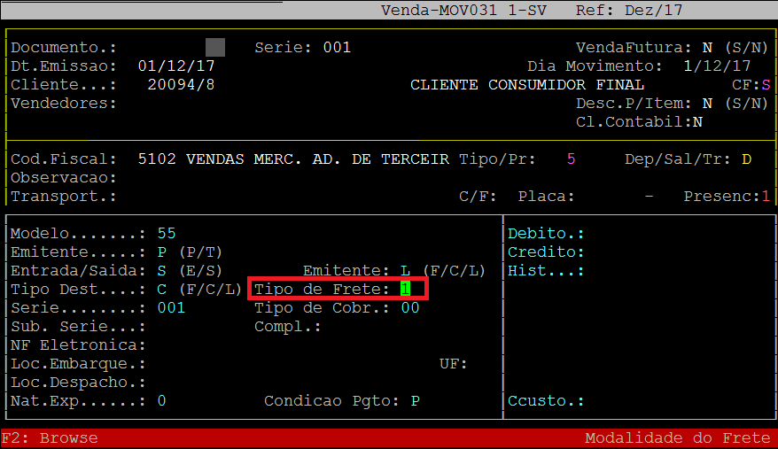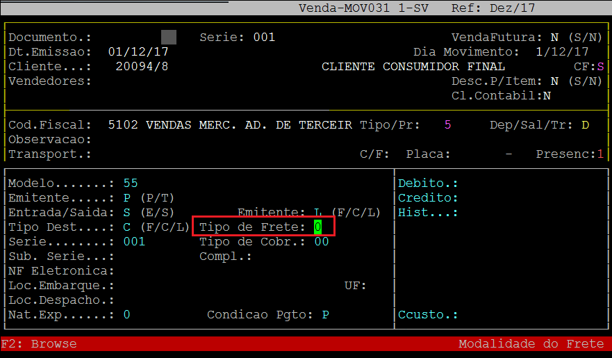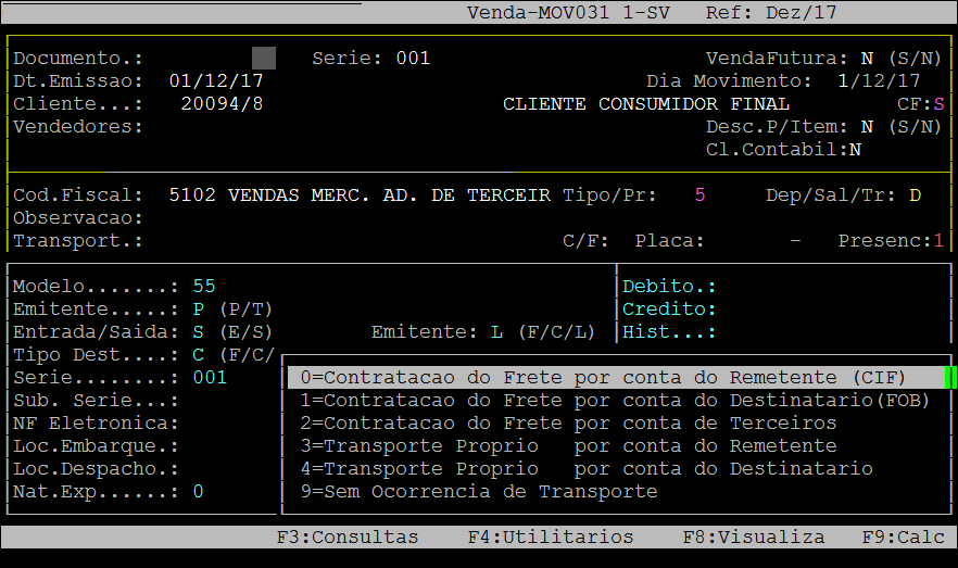 Tipos de Frete Versão 4.0 ao pressionar F2