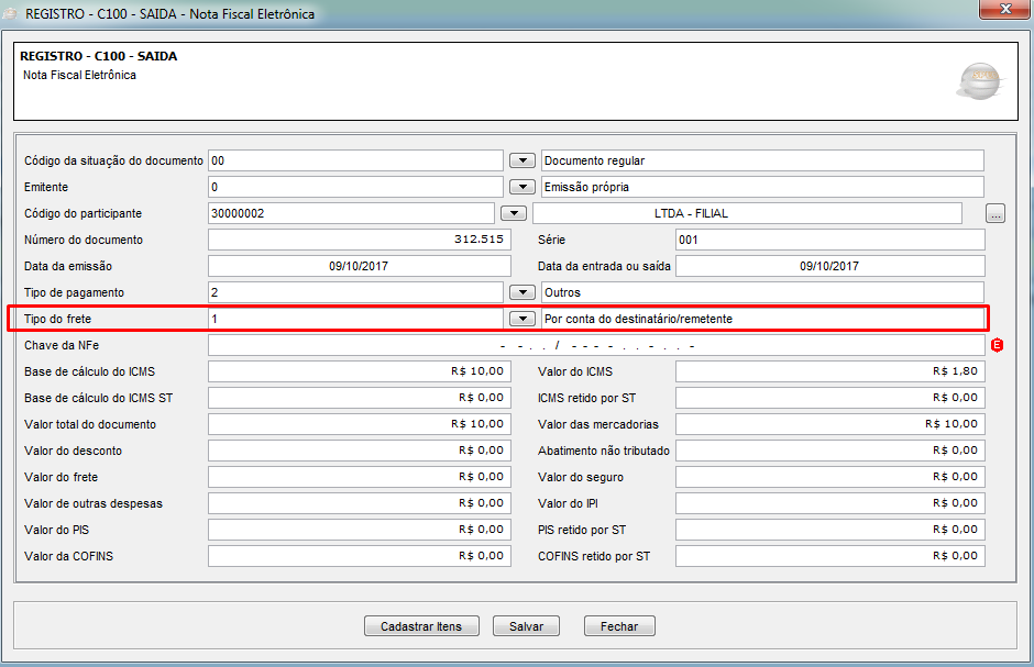 No exemplo abaixo iremos selecionar a opção do Ind-Frt = 0 - Contratação do Frete por conta do Remetente (CIF).