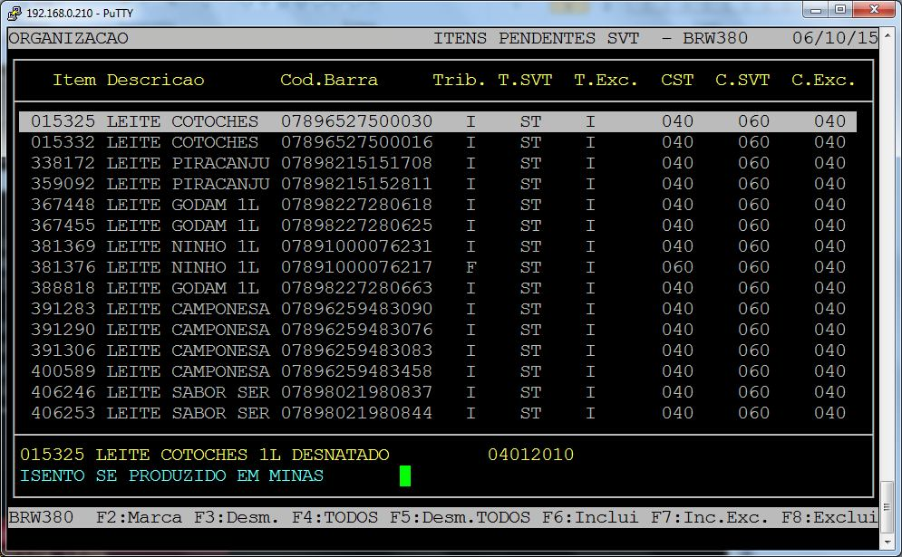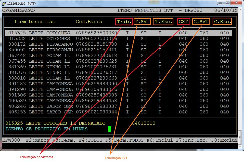 F6: Inclui - Após o item ser marcado pressionando a tecla F6 o item é alterado de acordo com a tributação da coluna T.SVT e C.SVT;