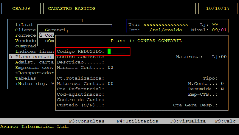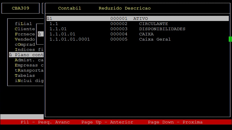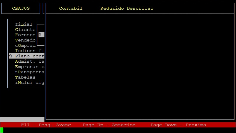 Pressione a tecla F2 no campo Código Reduzido para visualizar o Cadastro do Plano de Contas, note que o mesmo se encontra em branco.