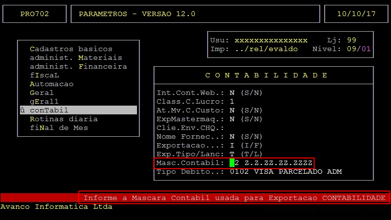 Exemplo: Conta Contábil: 1.1.01.01.0001, Máscara: (2) Z.Z.ZZ.ZZ.ZZZZ .