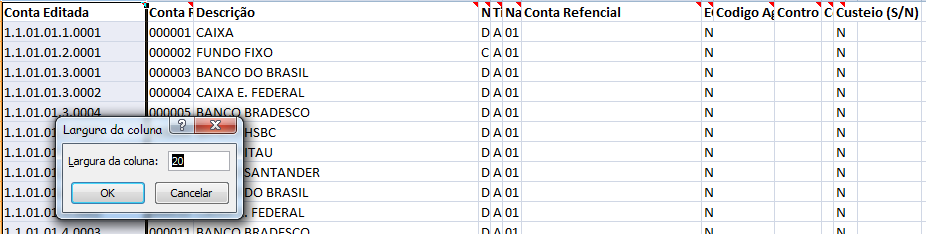 | Custeio: | Indica se a conta é de custeio, informar S ou N - (01 posição). |