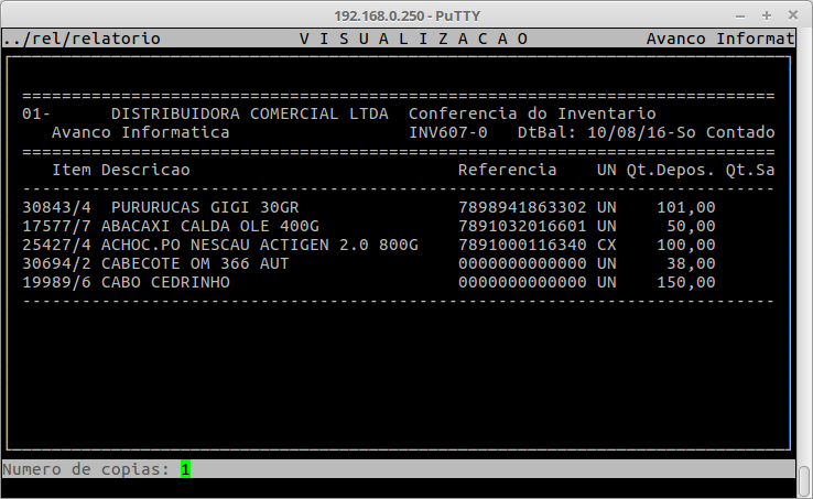 Caso queira imprimir o relatório, após emitir o relatório conforme o documento Dúvida | Como Emitir Relatório Inventário Integral?, abra o relatório no sistema Integral conforme o documento Dúvida | Como Exibir Relatório Inventário Tela Integral?, pressione a tecla "e", informe o número de cópias que deseja imprimir e pressione a tecla ENTER.
