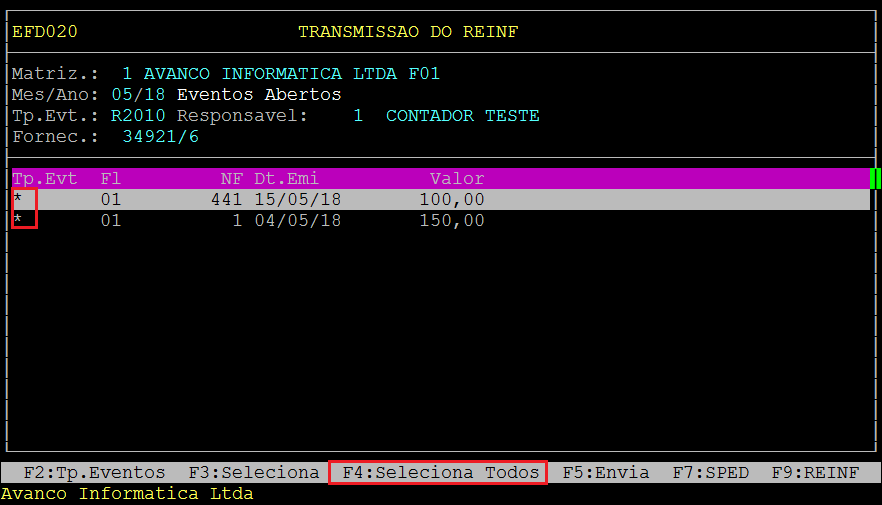 Em seguida digite F4:Selecionar Todos para selecionar a(s) nota(s) que será(ão) enviada(s).