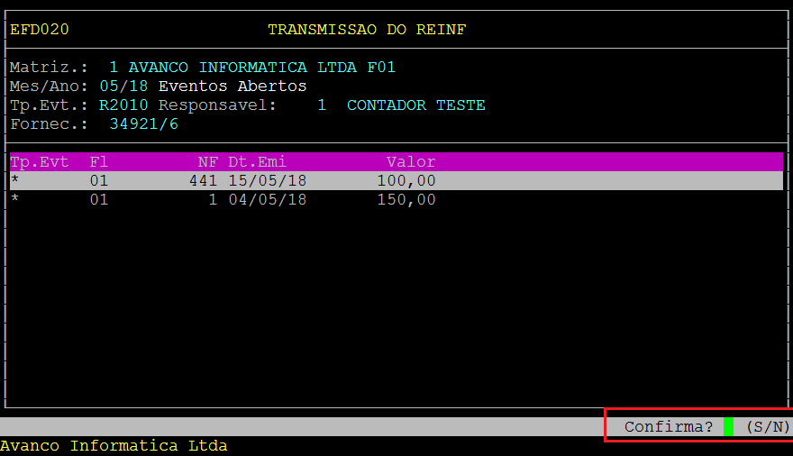 Em seguida confirme pressionando "S" - (Sim) para transmitir o Registro.