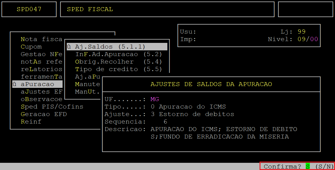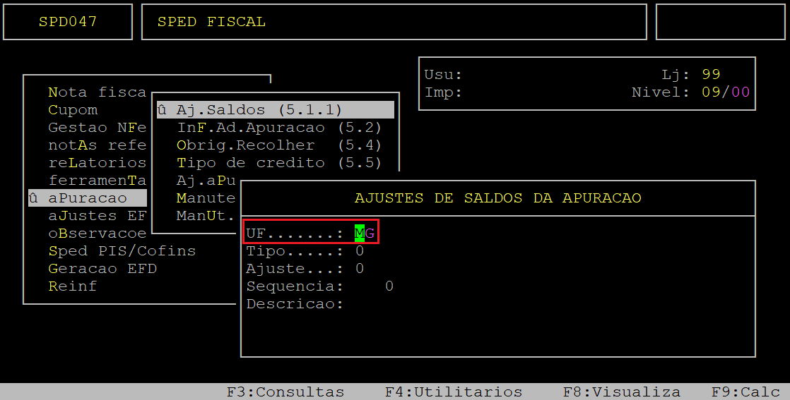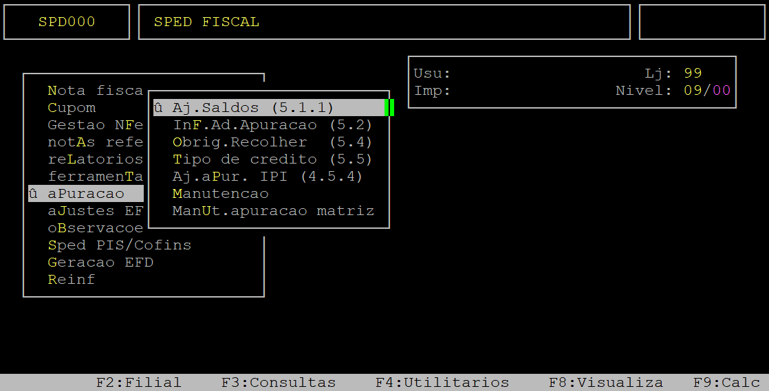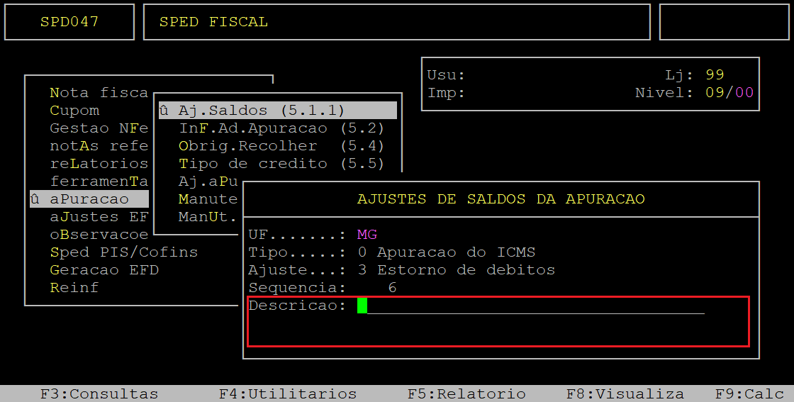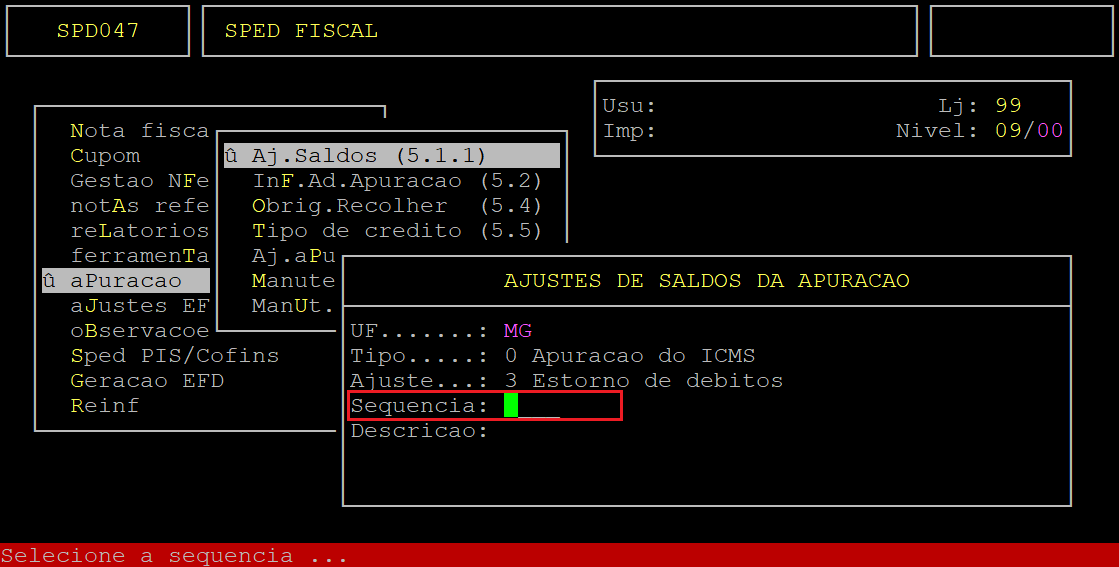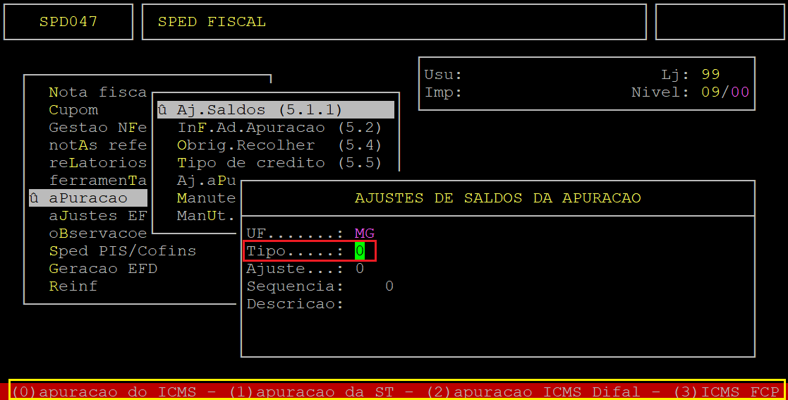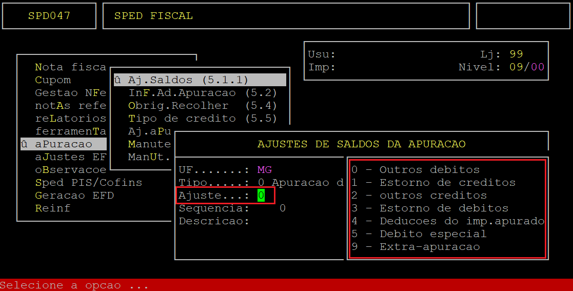 SPED EFD - NFe NFCe / Apuracao / Aj. Saldos (5.1.1) |